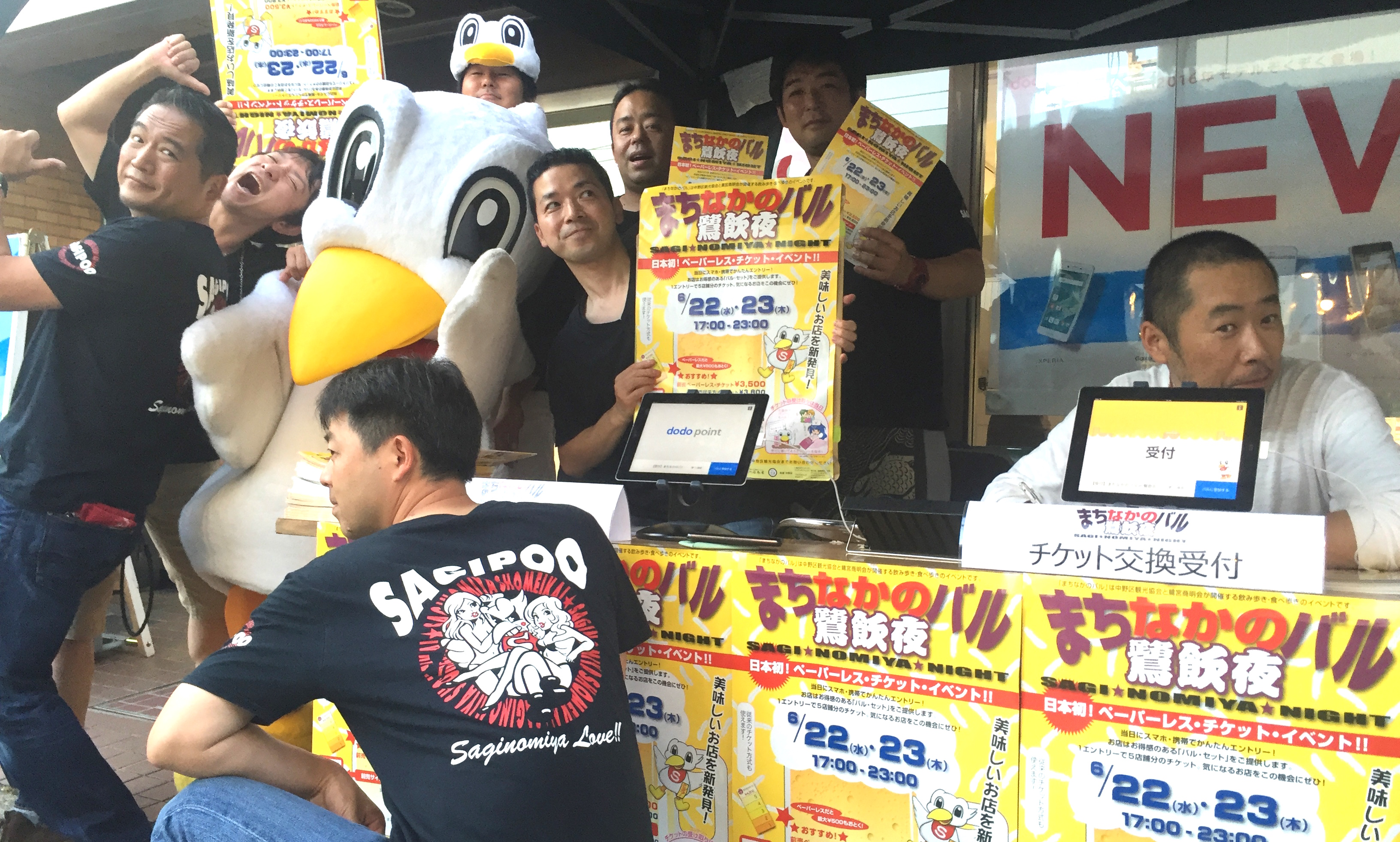「まちなかのバル in 鷺飲夜」は、中野の街をハシゴ酒するグルメイベントです。参加者は受付にて料金を支払い、dodo pointに携帯番号を登録。入力と同時に、番号をIDとしたアカウントに、参画店舗で使えるチケット(ポイント)が即時付与される仕組み。参画店舗をハシゴして回遊する際は、同じように店頭に設置されたタブレットに携帯番号を入力することでチケットを使用していきます。携帯番号をIDとして全ての操作が完結するので、従来利用していた紙のチケットや、アプリのダウンロードなどの煩わしさを解消。「ペーパーレス」の運用を実現しました。
