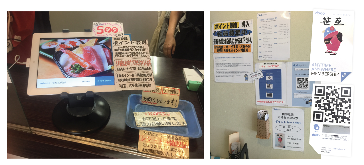 お客さんの年齢層が学生さんから年配の方まで幅広いので、より多くのお客さんに会員になってもらえるように、登録方法をお客様によって選んでもらってます。例えば、50~60代の方は、携帯を持ってなかったり、番号を覚えてなかったりするので、そういう方にはQRカード(※1)をお渡ししています。主婦層の方はカードを持ち歩かないことをメリットに感じているので、携帯番号で登録される方が多いです。後はdodoアプリ(※2)のダウンロード方法のPOPを作って、レジ近くの壁に貼ってあって、若い子達は、会計に並んでいる間にそれを見てダウンロードして、アプリ内のQRコードをタブレットにスキャンしてくれる人もだんだん増えてきました。