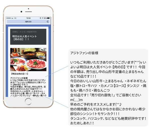 クーポンの開封率が見られるのがありがたい。前に使ってたメルマガでは確認できる機能がついていなかったから。メッセージやクーポンは、毎回テーマを変えて、内容が端的に伝わるように考えています。例えば「会員様限定!毎月10日は味与の日」、「誕生日クーポン」、「大寒波/大雪の日クーポン」「肉の日クーポン」などなど。一番反応が良いのは、やっぱり「肉の日(29日)クーポン」かな。